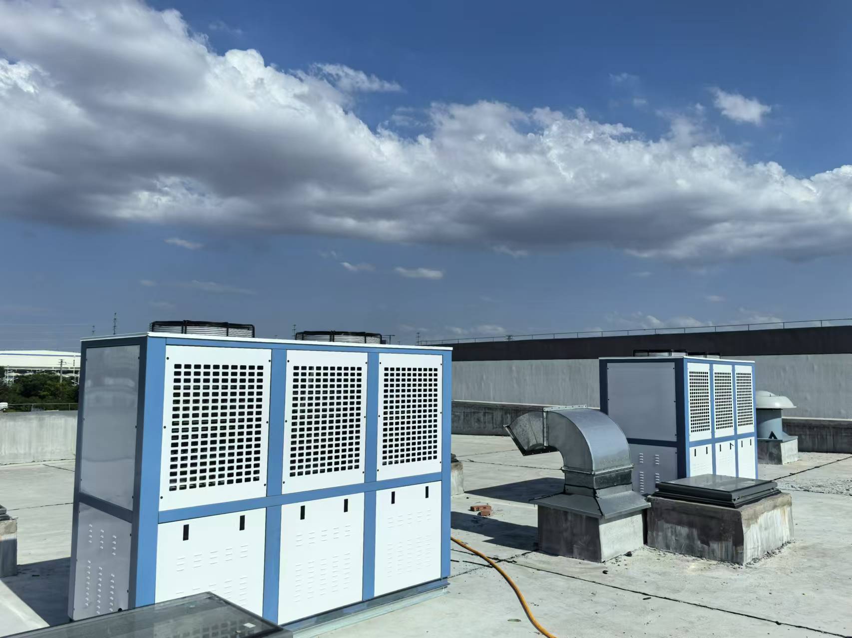 采用三臺(tái)艾默生谷輪全封閉渦旋壓縮機(jī)風(fēng)冷冷凝箱式制冷機(jī)組(核心部件艾默生谷輪全封閉渦旋壓縮機(jī)ZB115KQ中溫專用);