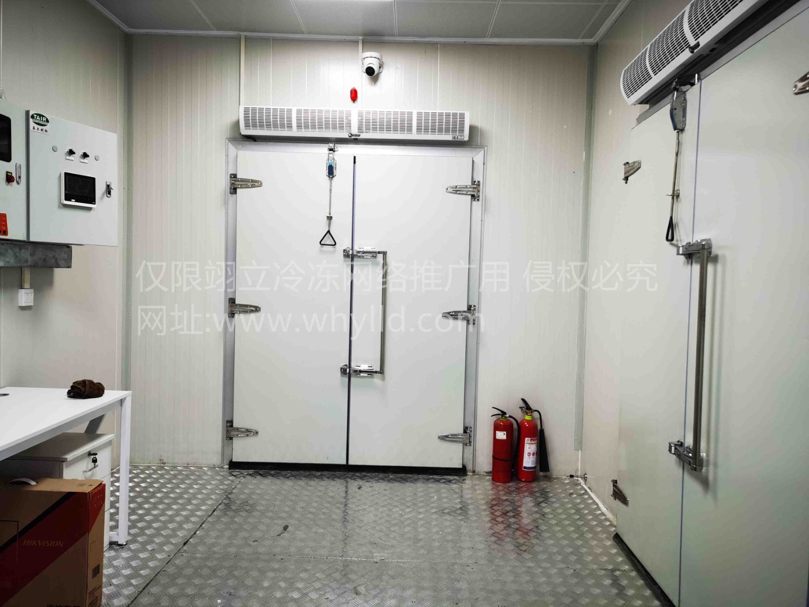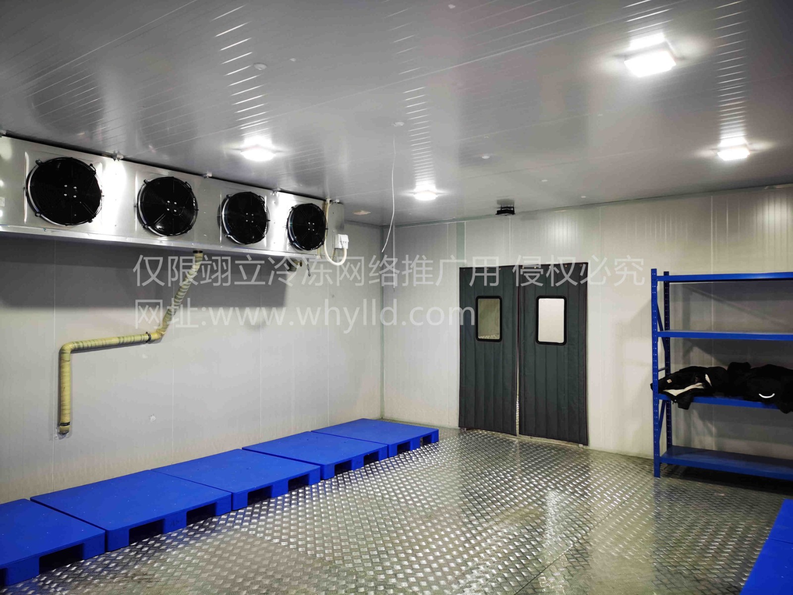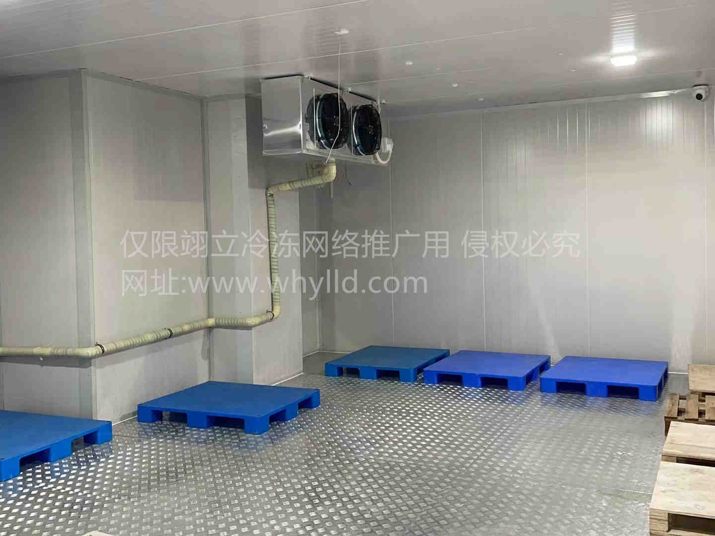 冷藏庫采用兩臺美樂柯牌風冷箱式制冷機組(核心部件艾默生谷輪全封閉渦旋壓縮機ZB48KQE中溫壓縮機);蒸發(fā)器DD80(6mm翅片距)/電加熱化霜冷風機;R404A環(huán)保冷媒;節(jié)流機構(gòu)采用丹佛斯熱力膨脹閥(性能可靠穩(wěn)定);系統(tǒng)閥件采用銅制閥件;