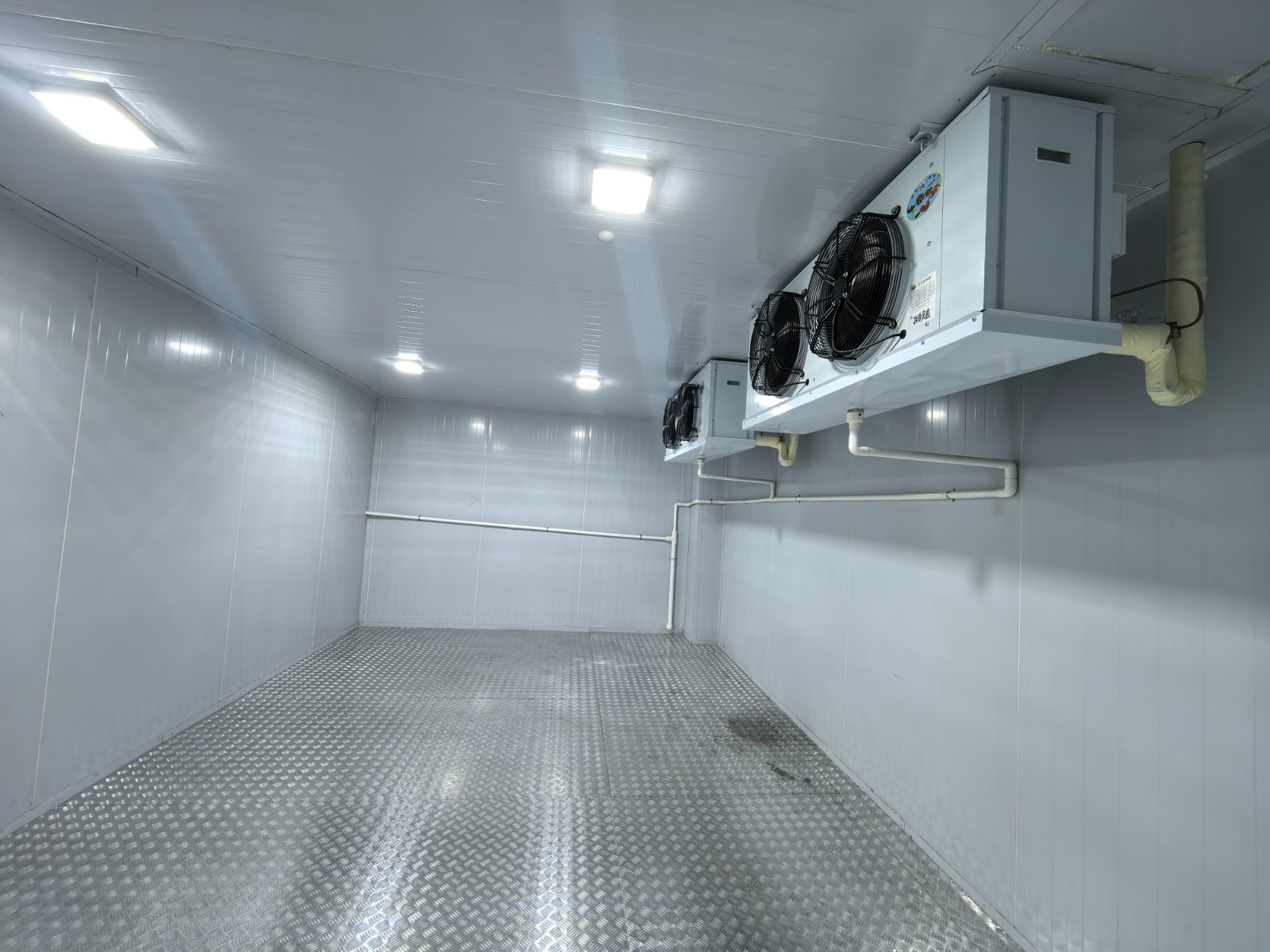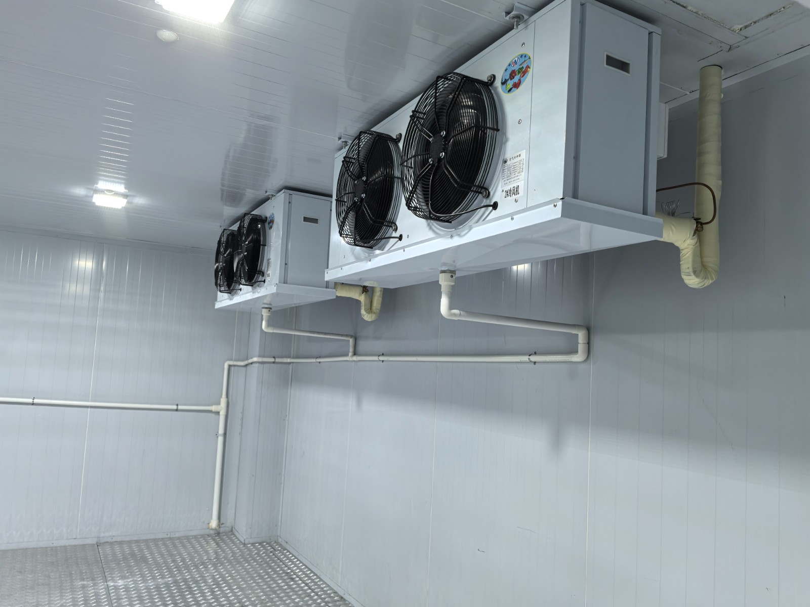 藥品冷庫采用兩臺美樂柯牌風(fēng)冷箱式制冷機(jī)組(核心部件艾默生谷輪全封閉渦旋壓縮機(jī)ZB45KQE中溫機(jī)組);蒸發(fā)器DL55*4臺(4.5mm翅片距)/電加熱化霜冷風(fēng)機(jī)/雙層保溫接水盤;節(jié)流機(jī)構(gòu)采用丹佛斯熱力膨脹閥(性能可靠穩(wěn)定);系統(tǒng)閥件采用銅制閥件;